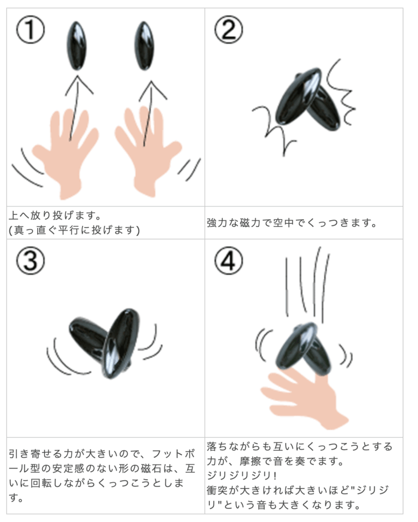 強力な磁力をもつサウンド磁石を上へ放り投げると、お互いの磁力により空中でくっつき、落下中にジリジリ・・・と音を奏でます。