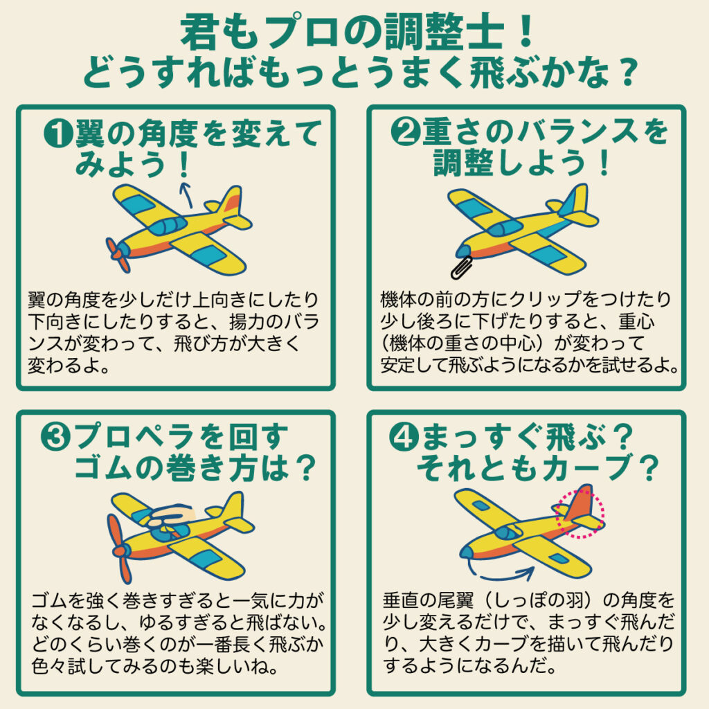 ライトプレーンの面白さは、ただ飛ばすだけじゃないところ!自分で調整して、もっとうまく、もっと長く飛ばす工夫ができるところなんだ。