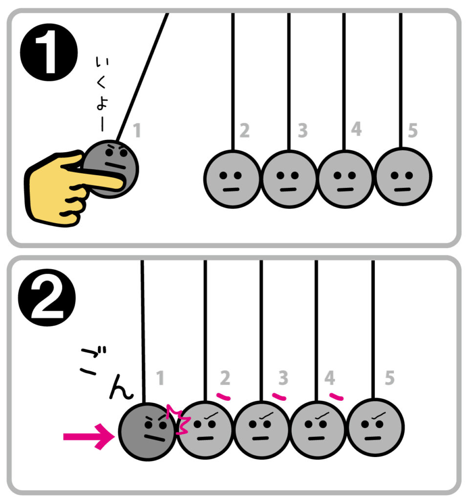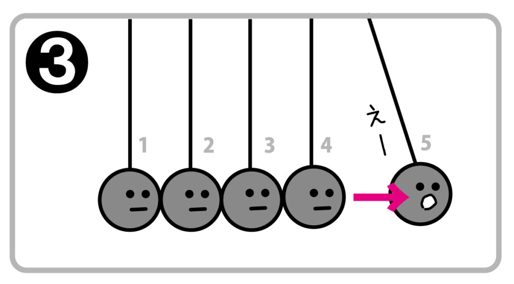 5個連なっている衝突球の1つの玉をぶつけると他の玉はどうなるかな?