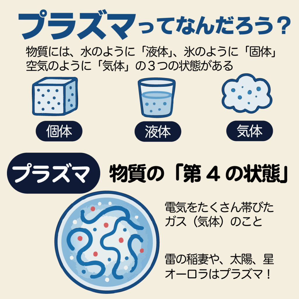 物質には、水のように「液体」、氷のように「固体」、空気のように「気体」の3つの状態があるよね。でも、実はもう一つ、特別な状態があるんだ。それが「プラズマ」!