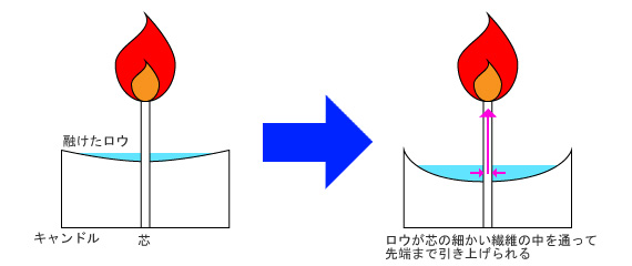 融けてカップ状になった「ロウ」は、底から伸びる芯へ“毛細管現象(ロウが芯の細かい繊維の中を移動する)”によって火のついている芯の先端まで引き上げられる。引き上げられた「ロウ」がさらに熱せられて高温の気体になり、空気中の酸素と混ざり合い炎となって燃え続ける。