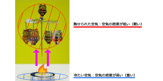 このように温度変化による「空気」の密度も同様で、熱せられた空気は膨張して上昇し、それが風車となる羽根を押し回しているのである。