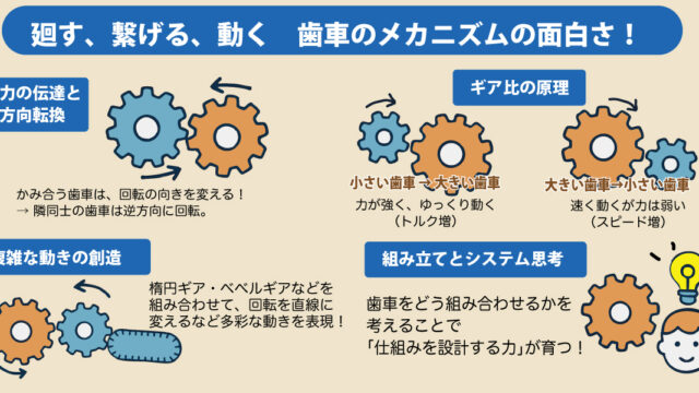 力学 歯車を使った玩具:廻す、繋げる、動く!メカニズムの面白さを探求 私たちの周りの機械に欠かせない重要な要素、「歯車(ギア)」をテーマにしたおもちゃ歯車は、文字通り「歯」を持つ車輪のことで、複数の歯車をかみ合わせることで、「回転の力(トルク)」や「回転の速さ」を伝えたり、変化させたりする機械部品です。時計、... 2025.10.29 力学科学玩具カテゴリー