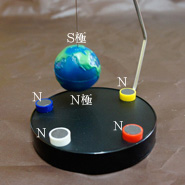 支柱からぶら下がっている”地球”もちゃんと「北極」と「南極」があり、その磁力の方向を信じれば、黒いトレーに向いている南極の方向は「N極」であろう。(地磁気として北極[N極]は北を向くのでS極、南極[S極]は南を向くのでN極)