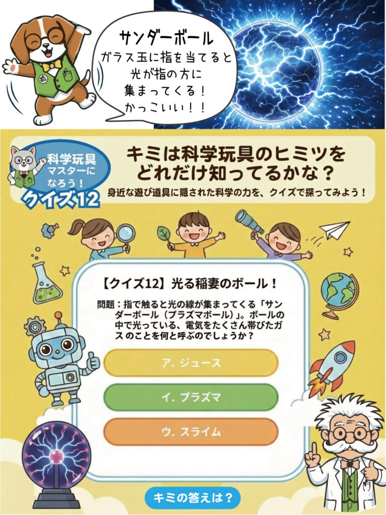 指で触ると光の線が集まってくる「サンダーボール」についてのクイズです。