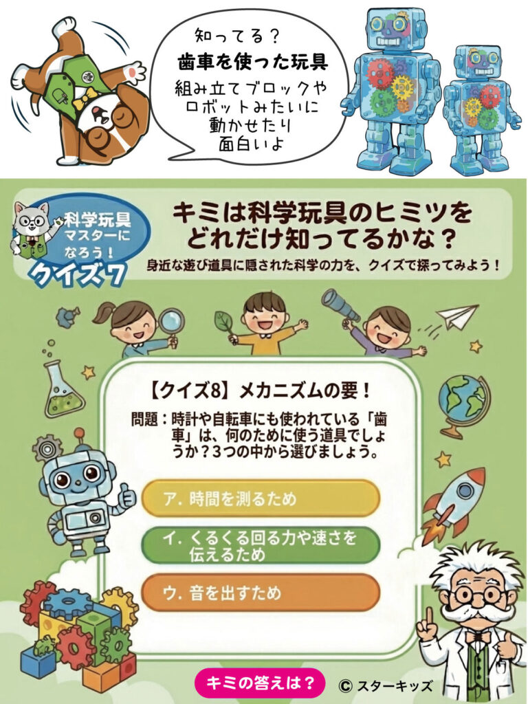 *問題:*時計や自転車にも使われている「歯車」は、何のために使う道具でしょうか?3つの中から選びましょう。